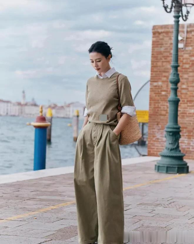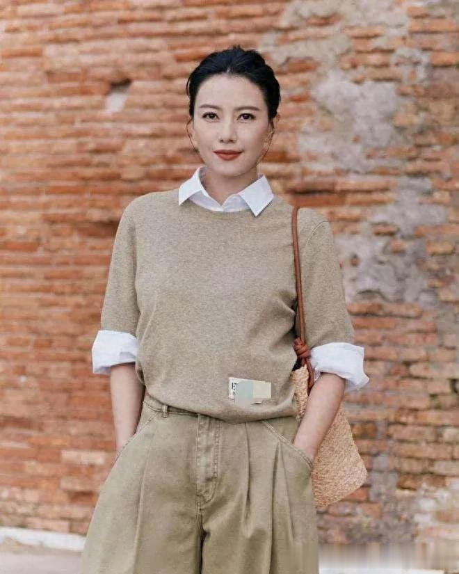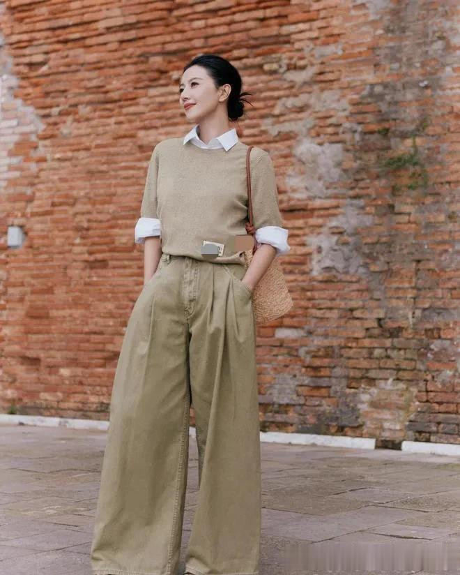 高圆圆真是穿搭高手! 衬衫+短袖衫+阔腿裤, 时髦高级又洋气